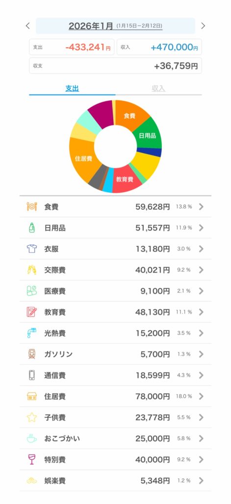 家計簿2026.02.21広告nachan【5人家族】30代夫婦✖️三姉妹2026年1月リアル家計簿 ポスト シェア はてブ 送る Pocket 2026年から家計簿を始めました。 目次1 家族構成2 収入と支出 家族構成 我が家は、 30代夫婦 小学生1人 未就学児2人 の5人家族です✨ 収入と支出 5人家族の1月の家計簿はこのような結果に! 今月は、ニトリで収納ボックスや新しいタオルなどを購入したので、日用品の金額が5万越え😱 特別費で、ヴォクシーにスモークを貼りました。4万円の出費💦 また、来月がんばります🔥